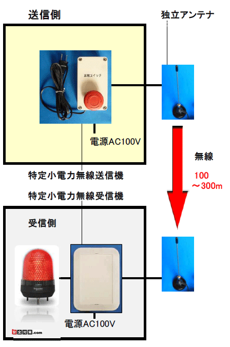 押しボタン緊急電波発信器のオンオフ操作で100〜300m離れた無線式回転灯を回転させて緊急通報や係員や保守担当者の呼び出し、人や自動車の無線交通誘導などに利用いただけます。